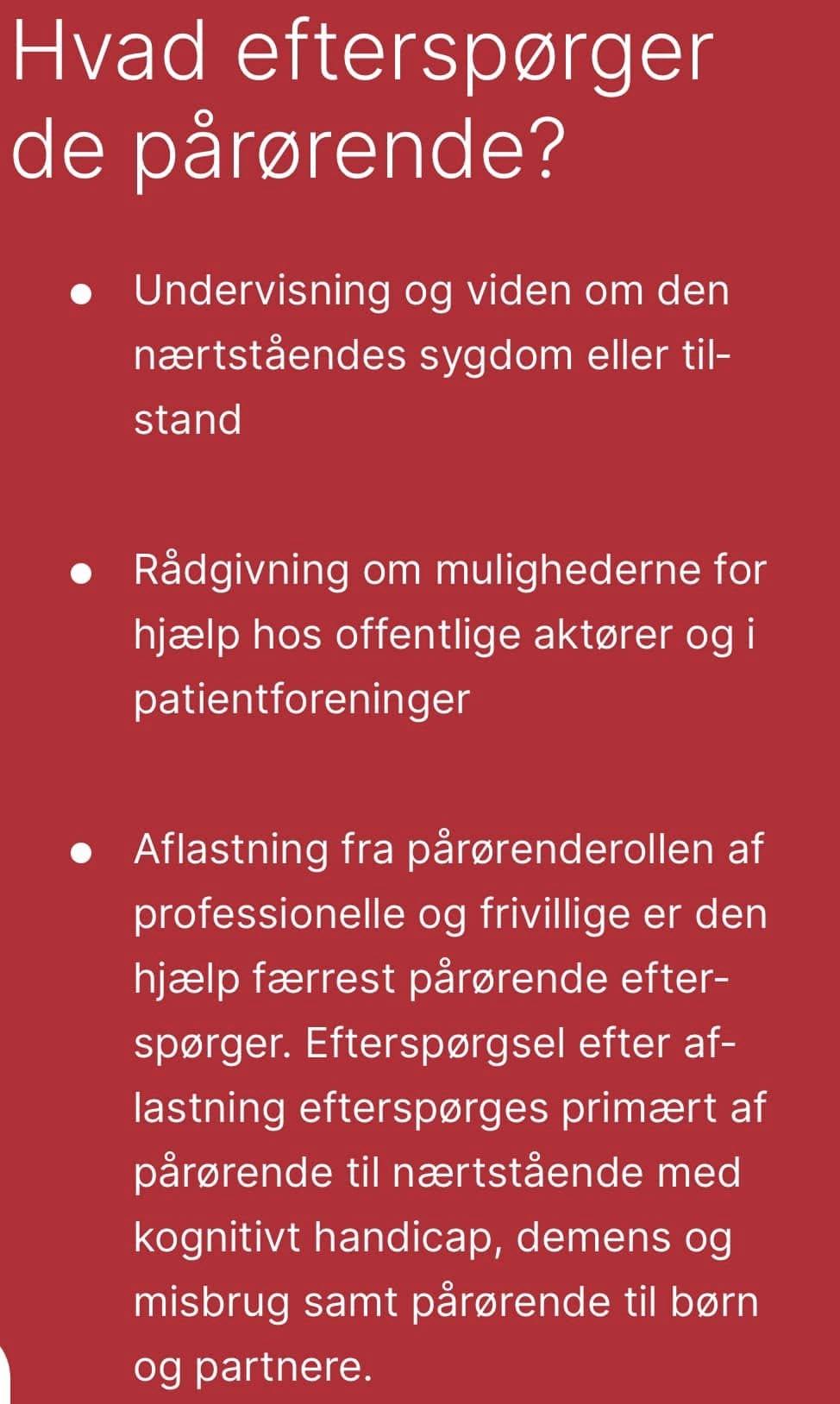 📌 De pårørende har bl.a brug for vejledning, konkret hjælp/støtte og rådgivning.